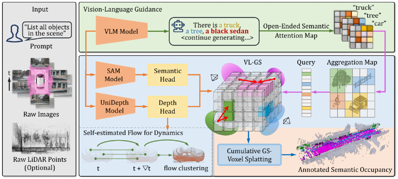 AutoOcc是一个高效、高质量的开放式三维语义占据栅格(Occupancy)真值生成框架;基于视觉语言模型和视觉基础模型,进行多视图场景重建,无需任何人类标注即可超越现有占据栅格标注和预测管线,并展现良好的通用性和泛化能力,在多个评测基准及长安汽车等车企的业务数据上取得了媲美人类标注的结果。