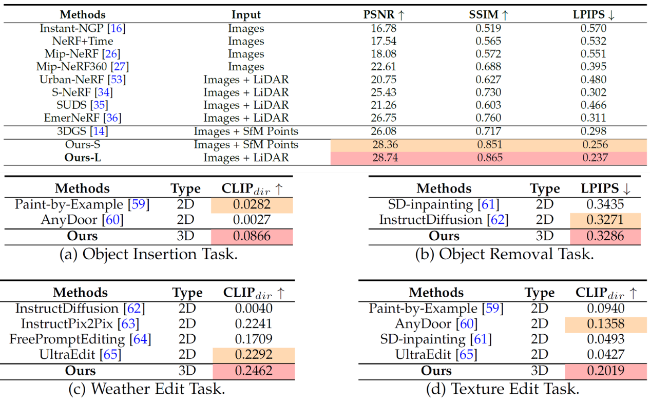 表4 DrivingGaussian++取得了领先的重建结果(上表)和场景编辑效果(下方四表)