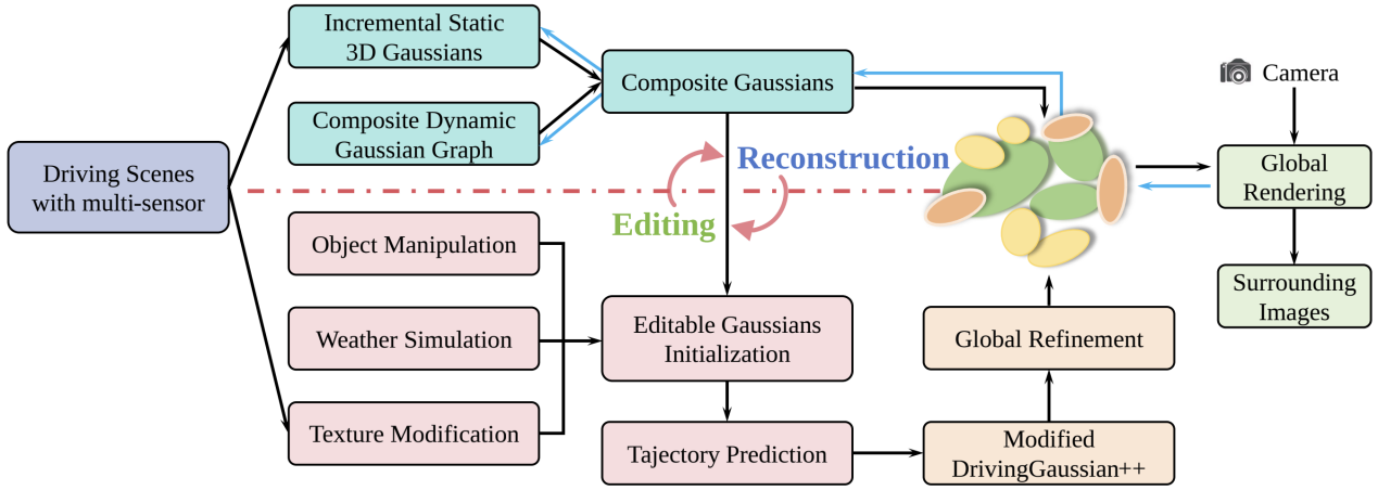 DrivingGaussian++是一个面向大规模动态驾驶场景的高效重建与编辑框架,通过复合高斯重建将场景分解为静态背景与动态前景,分别进行增量式重建,支持免训练的三维场景可控编辑,包括纹理修改、天气模拟和物体操控等任务,显著提升了驾驶场景数据合成的真实感与多样性。