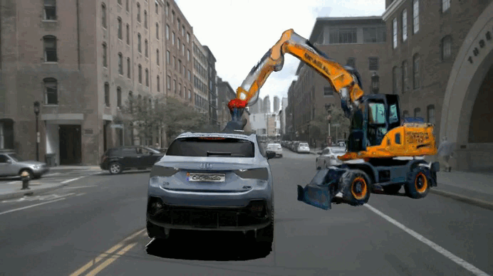 图10 DrivingGaussian++动态场景模拟示例(在自车前方添加行驶的汽车与挖掘机)