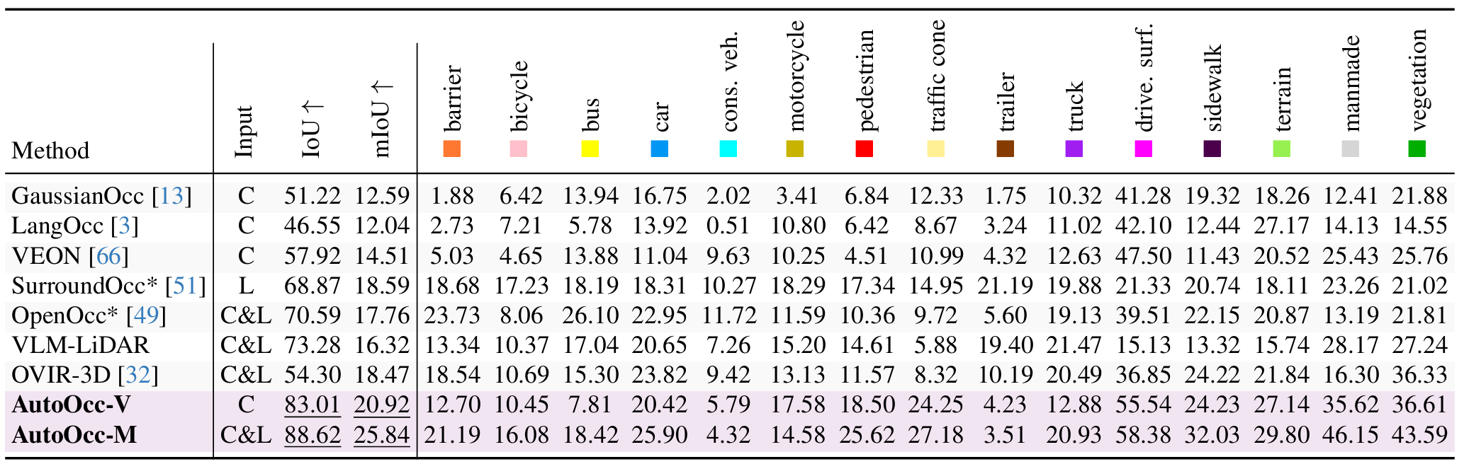 表1 在Occ3D-nuScenes基准上,AutoOcc取得了领先的占据栅格真值标注结果