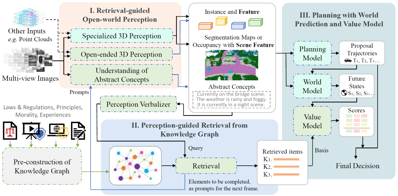 KnowVal是首个对齐交通法规、道德、防御性驾驶原则等人类偏好的端到端智能驾驶VLA(视觉-语言-动作)系统。它通过通专融合的开放世界感知,进行实例特征抽取、场景特征抽取和检索引导的抽象元素理解;并对一个构建的包含了法律法规、道德原则、防御性驾驶原则的知识图谱进行感知引导的检索,得到相关性由高到低排列的知识条目及其特征词元;最后通过规划模块、隐式世界模型模块和价值模型,进行价值评估,选定规划轨迹。在多个国际基准上,KnowVal均取得了领先的自动驾驶结果。