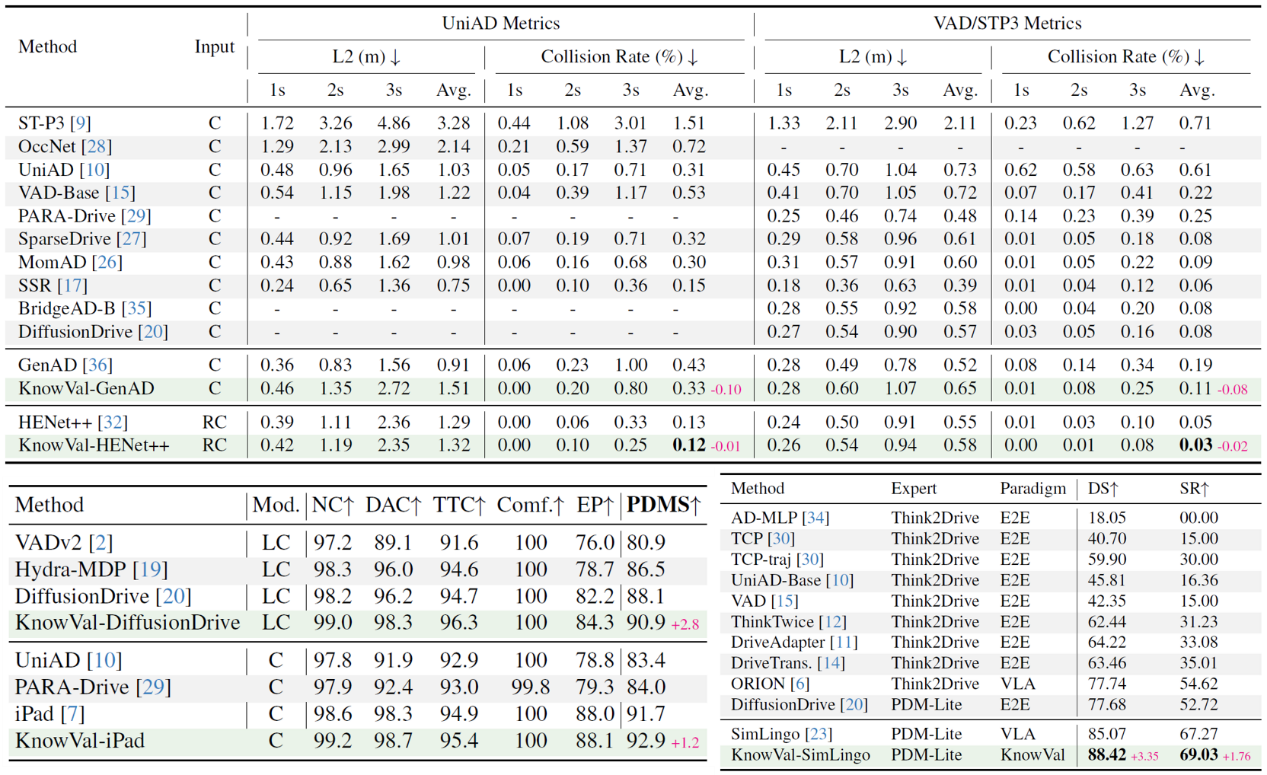 表3 KnowVal在nuScenes(上方)、NAVSIM(左下)、Bench2Drive(右下)基准上取得领先的自动驾驶结果