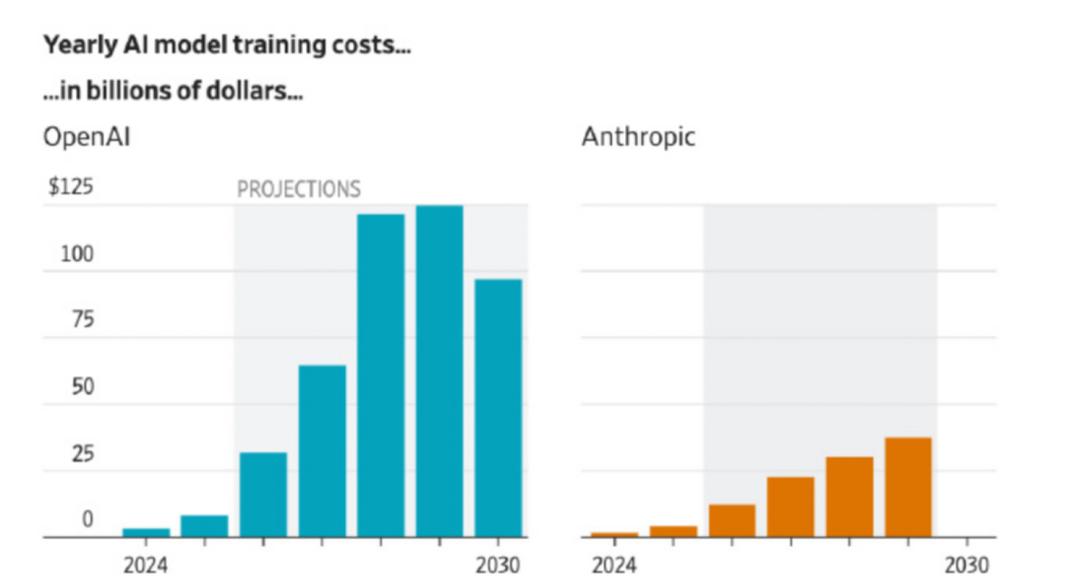 以OpenAI为例,其对投资者表示,预计到2028年算力支出将达到1210亿美元,届时亏损可能会达到850亿美元,或将超越已有上市公司的亏损记录。