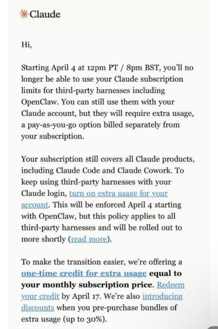 几天前,Anthropic向所有用户发送邮件,宣布自当地时间4月4日下午3点起,Claude Pro和Max订阅将不再覆盖OpenClaw等第三方工具的使用。