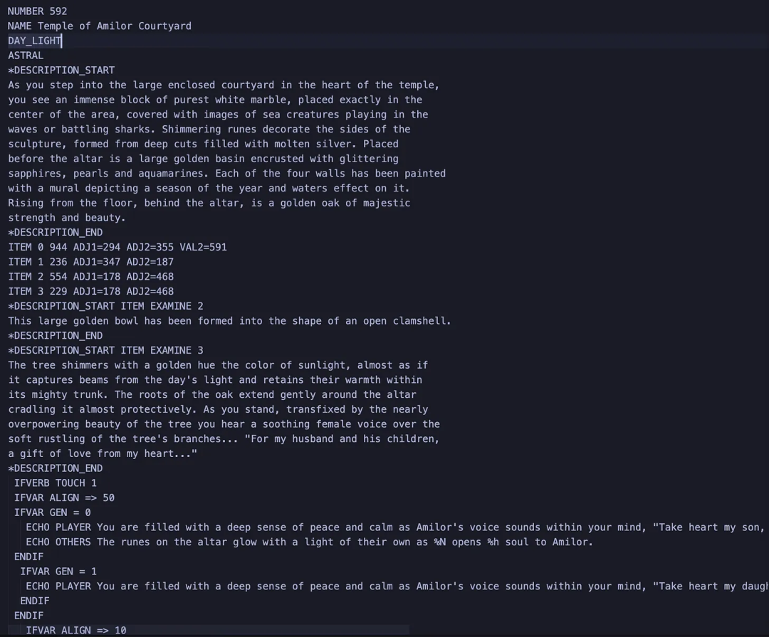 一份完整的脚本文件——是用他19岁时发明的一种自定义脚本语言编写的,定义了游戏世界中的每一个房间、怪物、物品、法术和互动事件;
