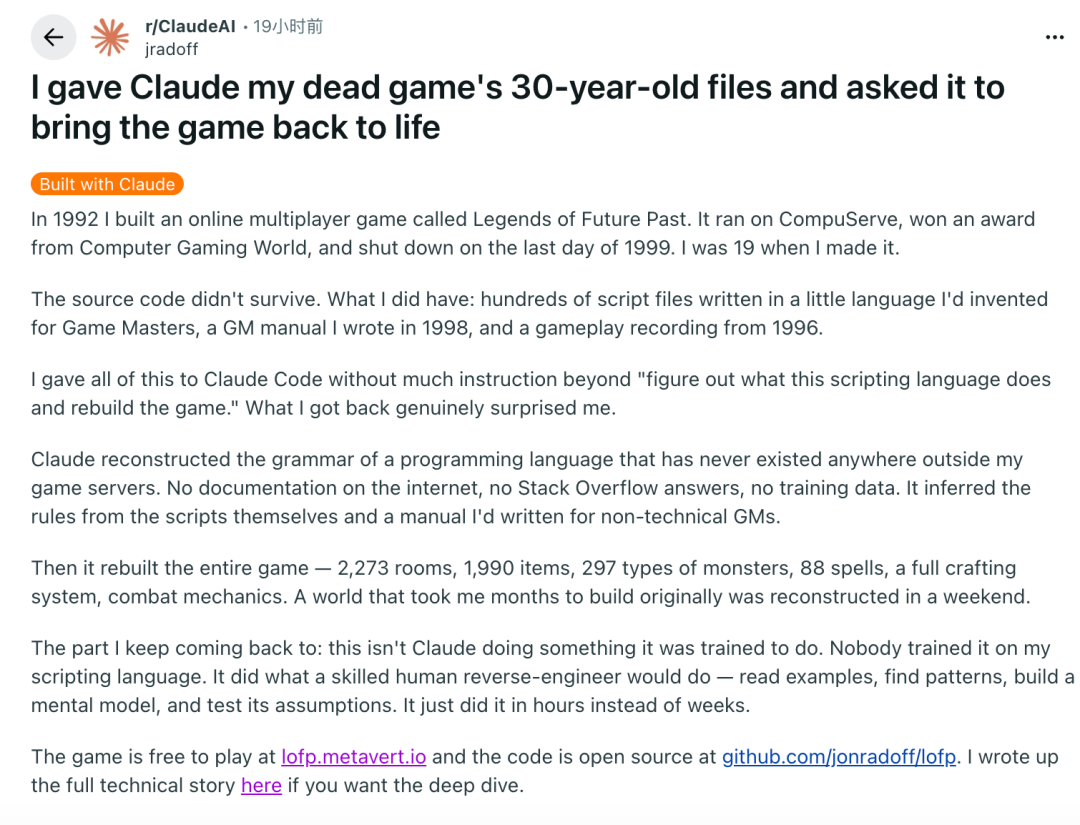 出乎意料的是,Claude Code竟然反向工程了30年前他自定义的脚本语言。并且仅凭一点资料,完整重建了游戏世界。