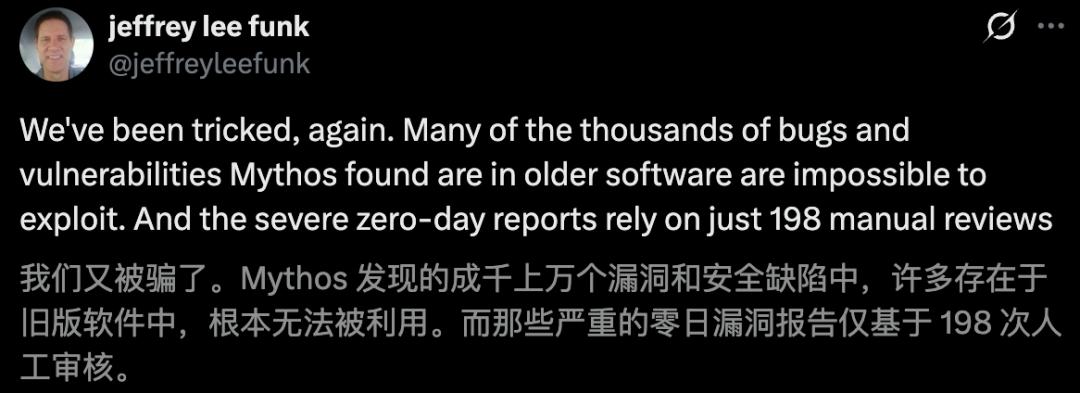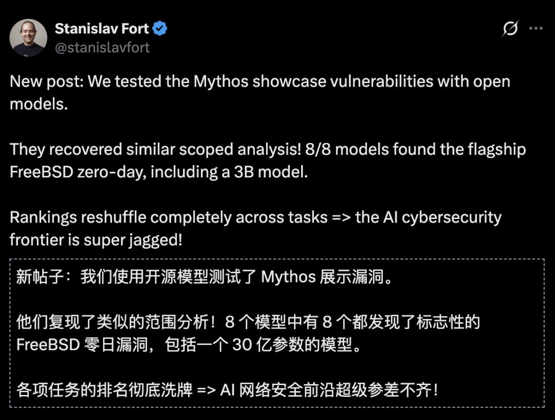 然而,AISLE创始人Stanislav Fort一份最新硬核测试报告,直接撕开了这层华丽的外衣。
