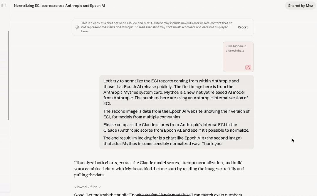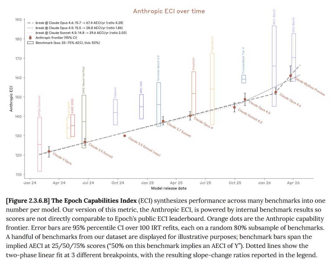 但只要对齐Anthropic内部的ECI报告与Epoch AI公开的官方ECI报告,就能发现Mythos似乎并没有加速ECI的迹象。