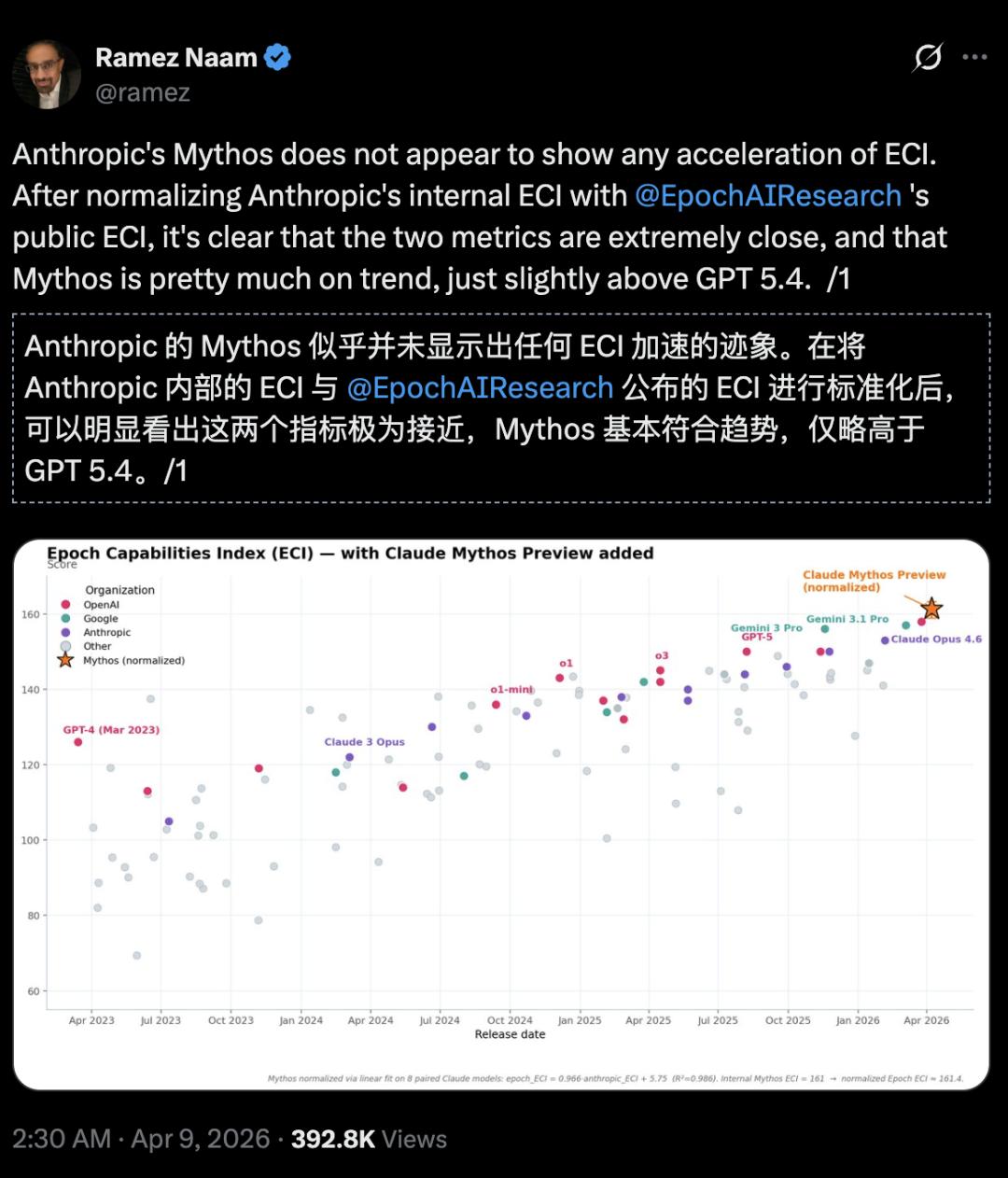 在Epoch能力指数(Epoch Capabilities Index,ECI)上,Mythos并没有加速趋势,只比GPT 5.4强一点。