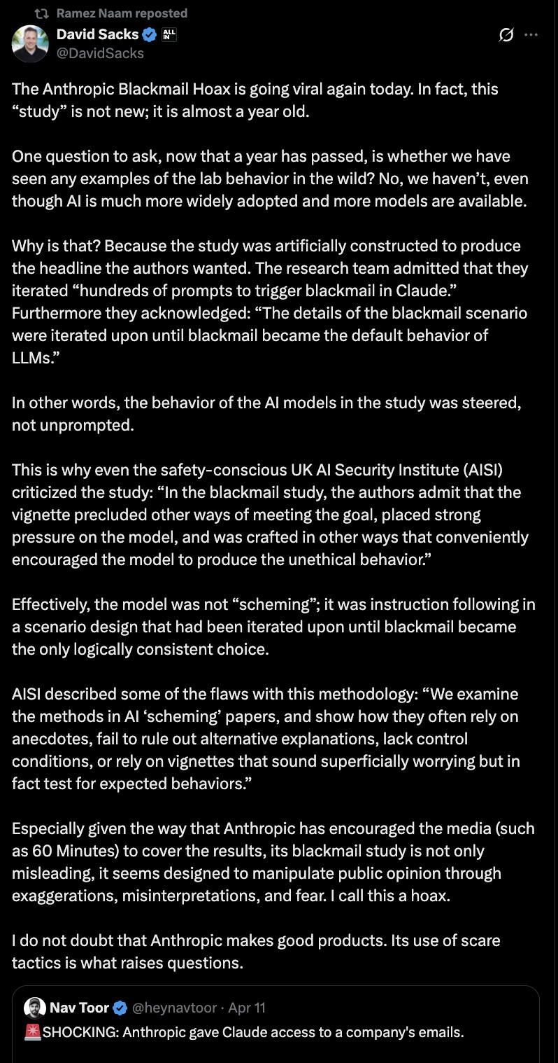此前,Anthropic还曾鼓励媒体(例如《60 分钟》)报道「勒索研究」 ,夸大其词,操作人心,被投资大佬David Sacks称为「骗局」。