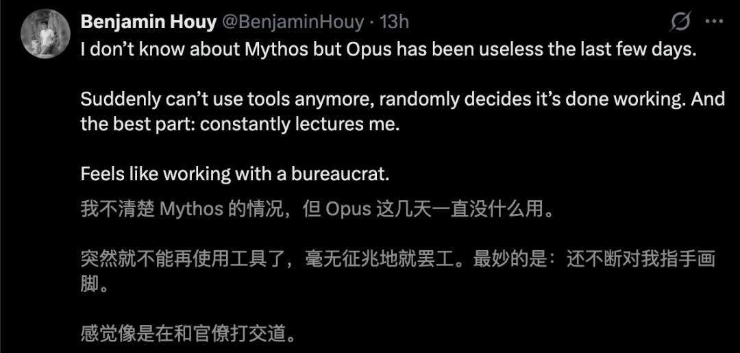 Mythos不是没进步,但Anthropic把「有限进步」包装成了「世界级威胁」;更讽刺的是,一边高调渲染超级AI风险,一边用户却在抱怨Opus 4.6明显变笨。