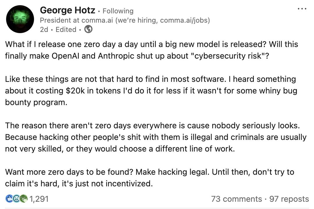 https://officechai.com/ai/anthropic-and-openai-are-exaggerating-cybersecurity-risk-says-hacker-george-hotz/