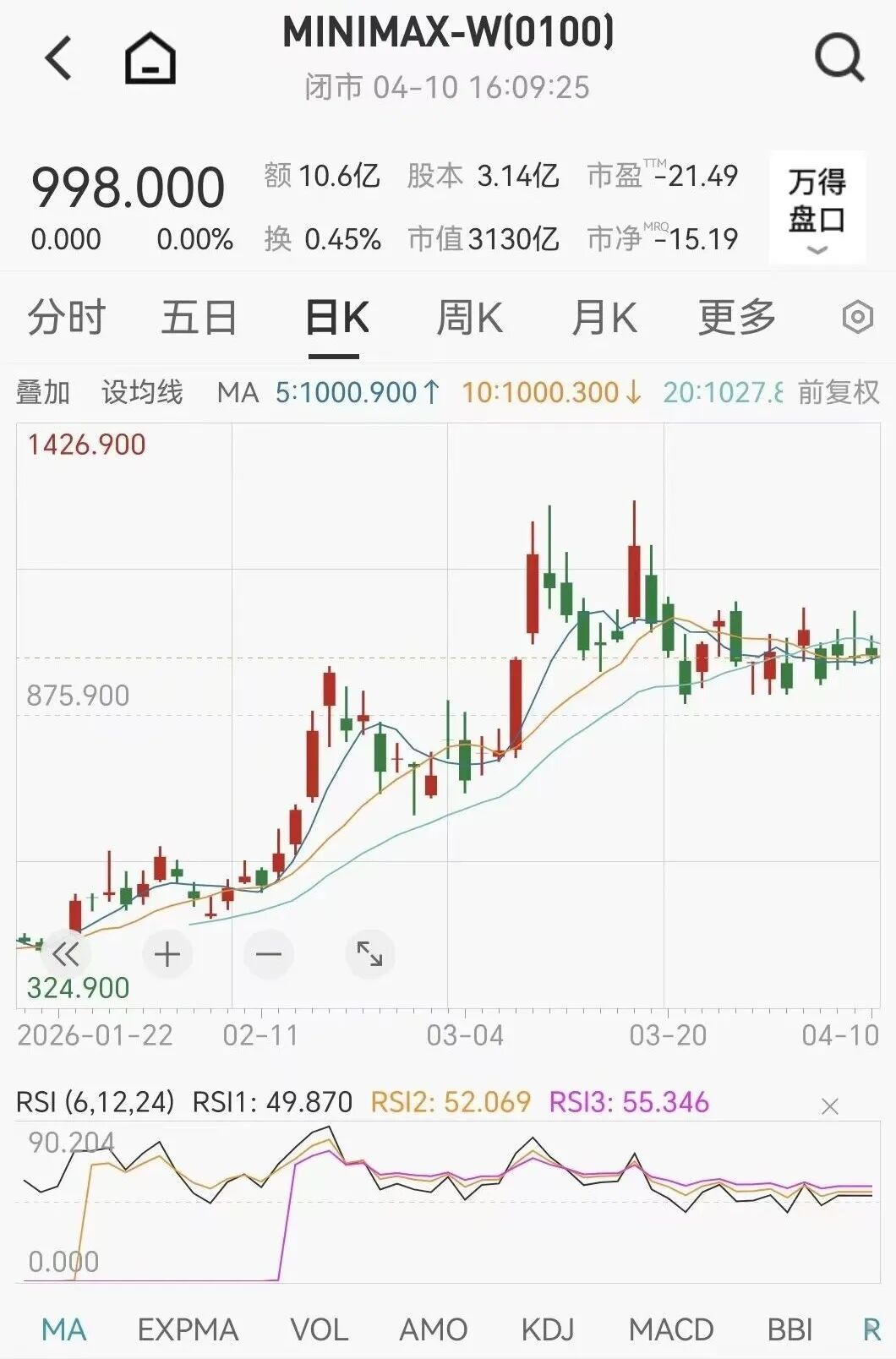 截至4月10日收盘,MiniMax股价报998港元/股,总市值达3130亿港元。