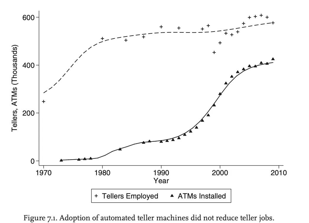 柜员原本有很大一部分工作是办理存取款,但 ATM 直接将这部分工作自动化了。按理说,这本该导致大批柜员失业。