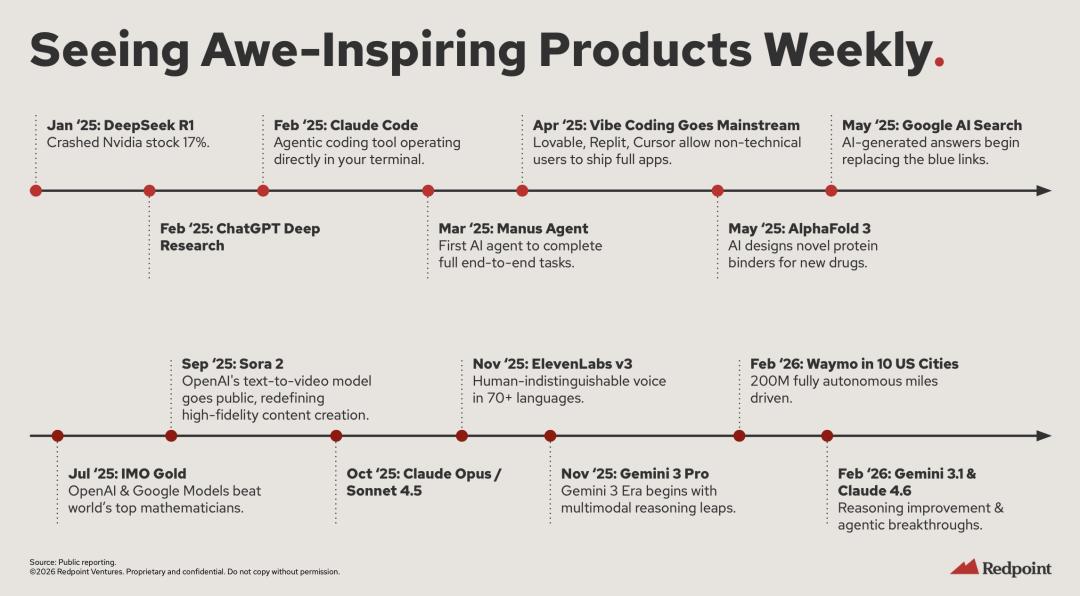 从下图我们能看到,过去一年里,每隔几周就会出现标志性的 AI 产品创新。在 AI Coding 能力取得新突破之后,这一速度还在加快。