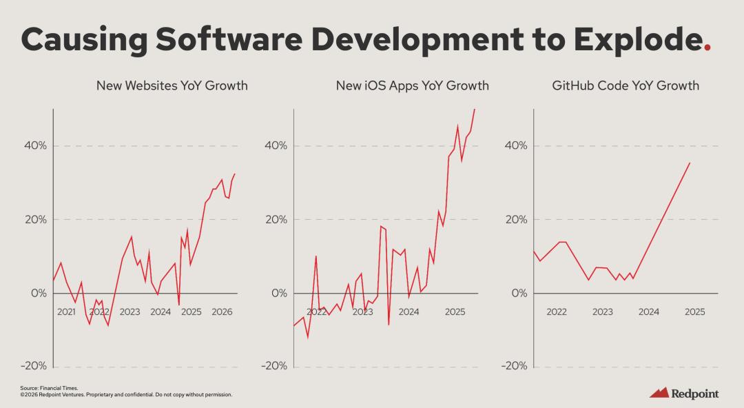 数据也在印证这一点。从下图可以看出,2024 年之后软件开发量迎来了爆发式增长。我们完全有理由相信,随着 AI 能力越来越强、掌握 AI Coding 的人越来越多,这个势头还将持续,直至迎来一个新的供需平衡。