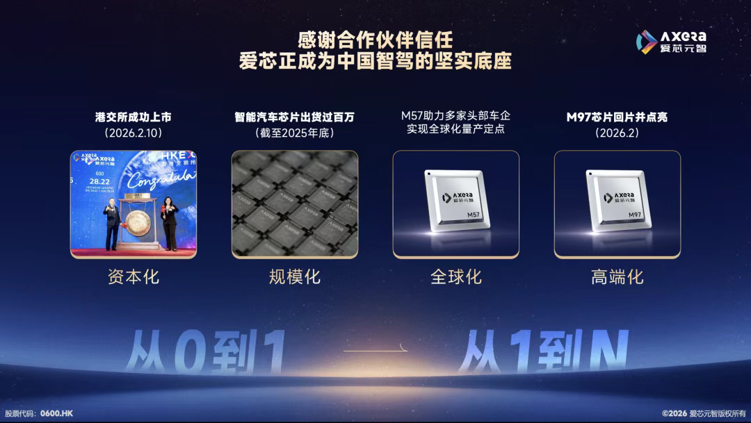 2026年2月,爱芯元智成功登陆港交所(股票代码:0600.HK),为规模化、全球化、高端化发展奠定了资本基础。以此为起点,公司正加速从1到N的跨越,推动更广泛的量产落地。2025年,公司合作主机厂品牌超过15家,其中包含超过5家国际品牌,全球化合作已迈入快车道。