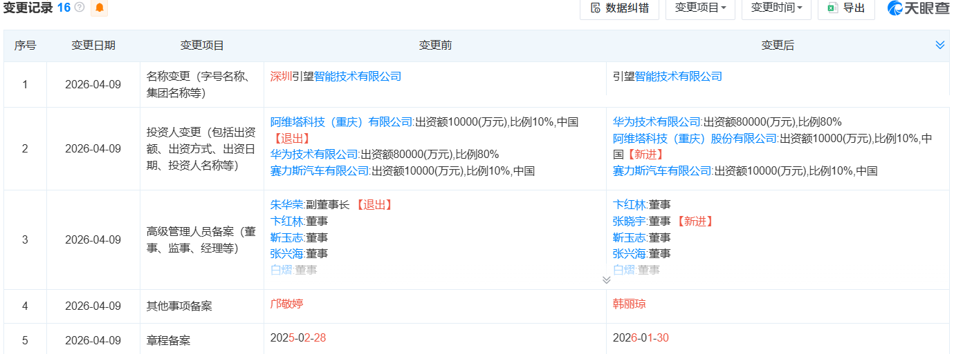 本次变更中,公司投资人结构出现重要变化。阿维塔科技(重庆)有限公司退出股东行列,阿维塔科技(重庆)股份有限公司新进成为股东,出资额为10000万元人民币,持股比例为10%。与此同时,华为技术有限公司持股比例保持不变,仍为80%,出资额80000万元;赛力斯汽车有限公司持股比例亦未变动,为10%,出资额10000万元。