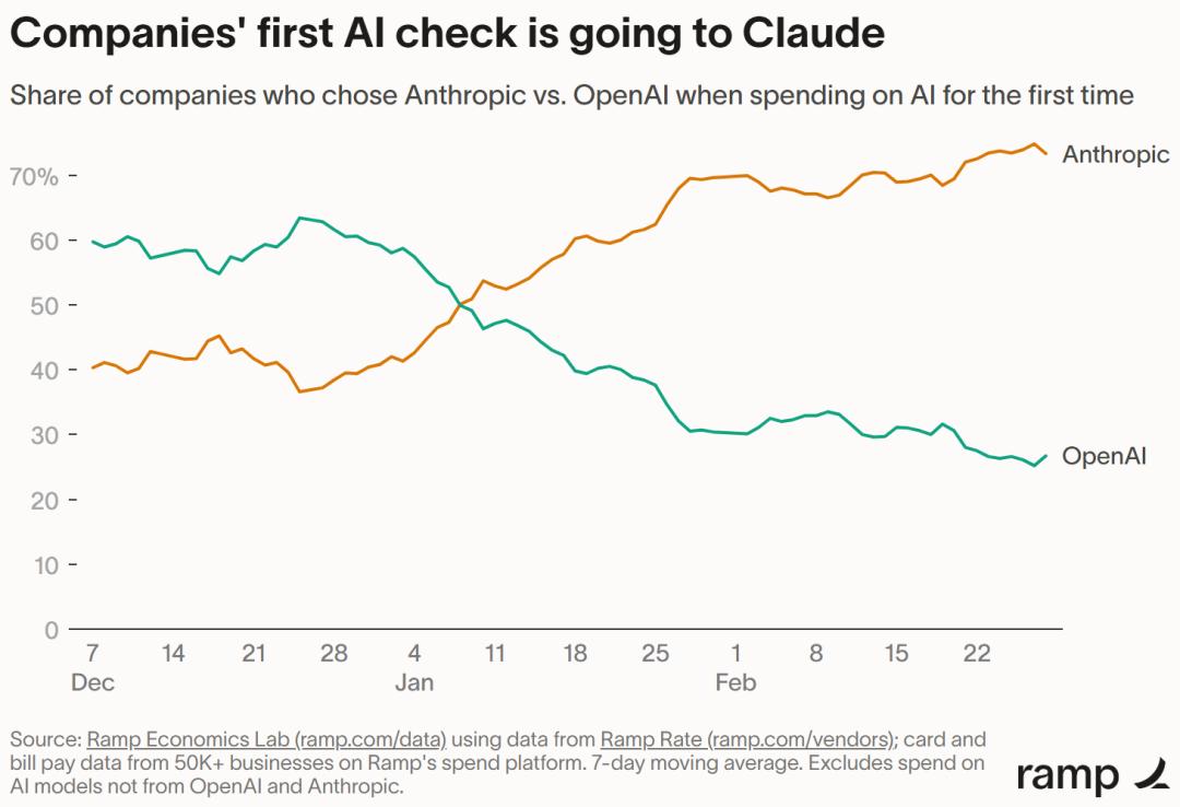 Ramp 经济学家 Ara Kharazian 在最新报告里抛出一个更狠的数字:在首次购买AI服务的企业里,Anthropic在与OpenAI的正面对决中,胜率高达 70%。