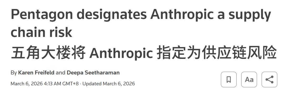 代价是惨重的——特朗普直接下令所有联邦机构停用 Anthropic 的技术,国防部把 Anthropic 列为「供应链风险」。