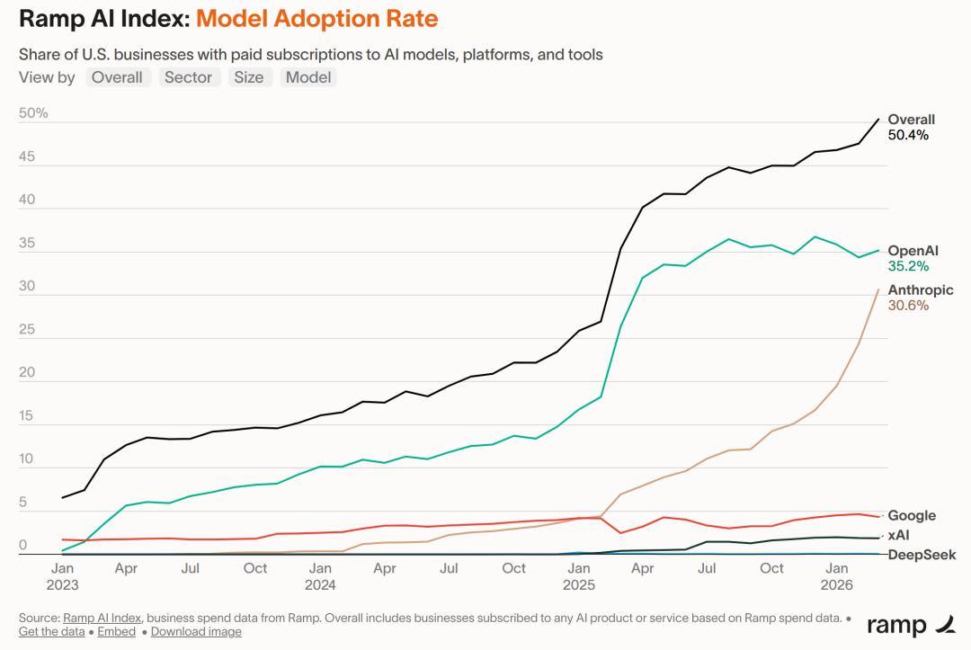 - 一年里 Ramp 上付费 Anthropic 的企业,从「25家里有1家」飙升到「4家里有1家」;