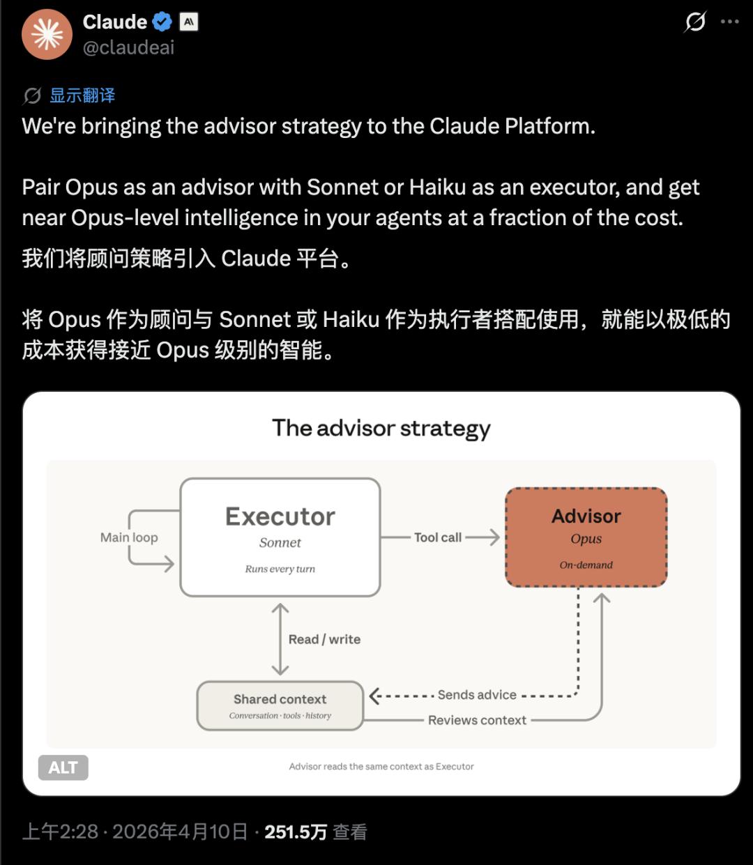 换个容易理解的比方:这就像实习生干活干到不会了,举手问一下总监。总监提点个方向,实习生继续干。总监按总监的工资算(Opus 价格),但只说了几句话,所以没多少钱;实习生跑全程(Sonnet/Haiku 价格),但单价不高,所以总成本很低。