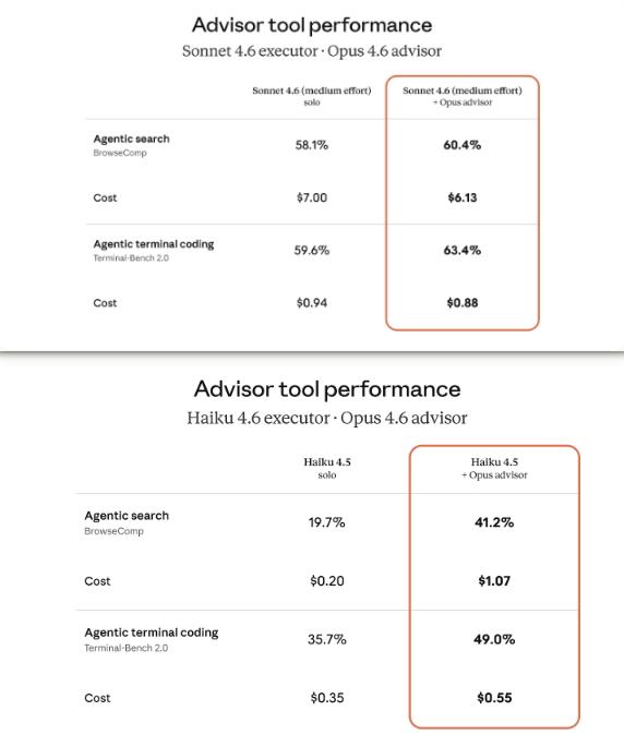 - Sonnet + Opus advisor 在 SWE-bench Multilingual 上比 Sonnet 单独高 2.7 个百分点,同时成本降低 11.9% - Haiku + Opus advisor 在 BrowseComp 上得分 41.2%,是 Haiku 单独(19.7%)的两倍多,但成本只有 Sonnet 的15% - Bolt 的 CEO 评价:「复杂任务上架构决策明显更好,简单任务完全没有额外开销」 - Eve Legal 的机器学习工程师:「在结构化文档提取任务上,Haiku 通过 advisor 动态升级智能,达到了前沿模型质量,成本降低 5 倍」