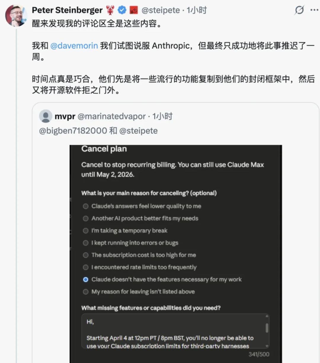 最近的一次,则是 Anthropic 推出 Dispatch(手机遥控桌面)和 Channels(IM 集成),这就是 Claude 自己的 OpenClaw,然后转头卸磨杀驴,禁了 OpenClaw。