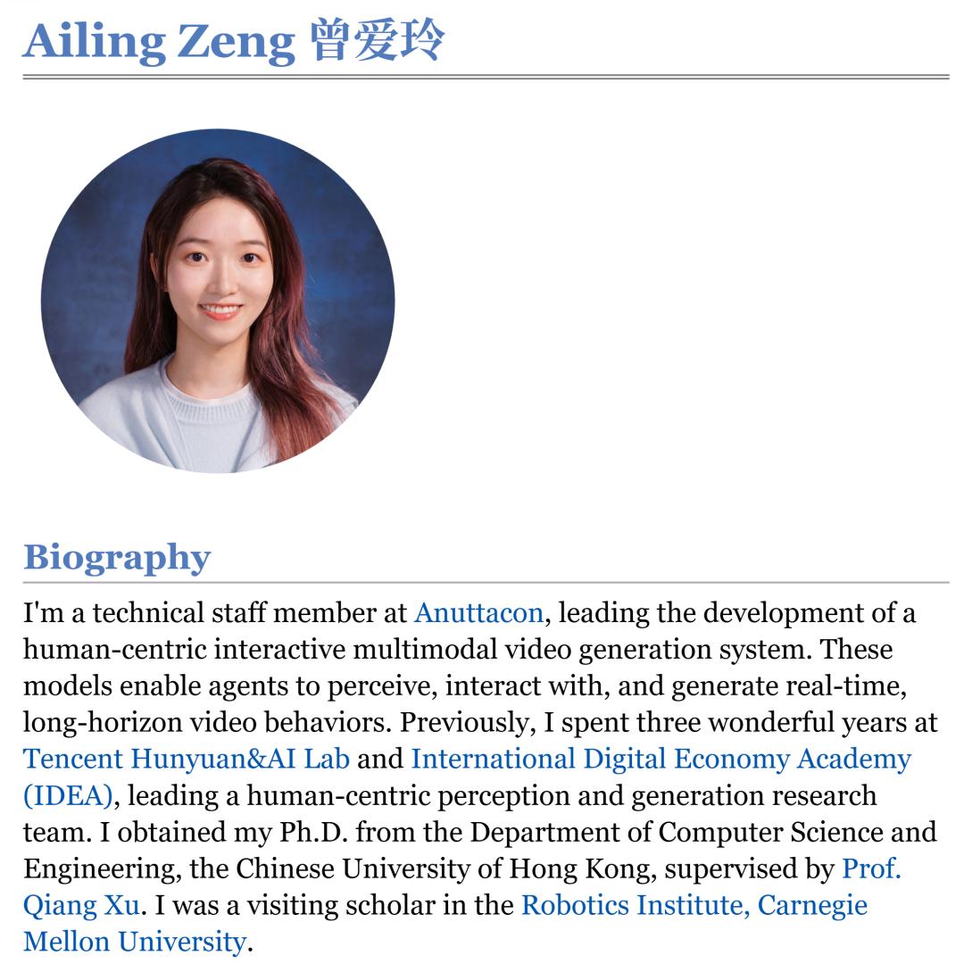 根据其个人主页信息,AilingZeng隶属于Anuttacon技术团队——就是蔡浩宇创办的那个AI公司。她此前曾在腾讯混元团队与AI Lab实验室从事模型相关研究工作。