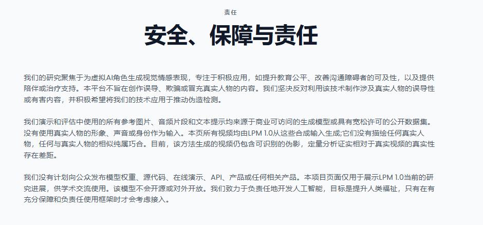 本次公开仅用于展示LPM 1.0当前的研究进展,供学术交流使用。该模型不会开源或对外开放。