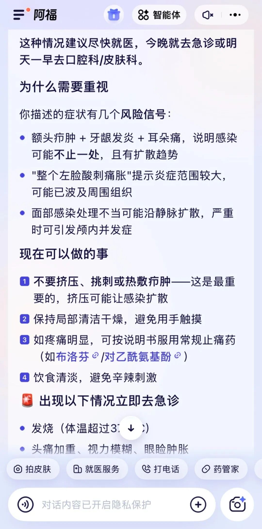 综合判断后,阿福给出了和Deepseek一致的建议,不要用手挤压或热敷额头上的疖子,否则容易引发颅内感染。同时,两个 AI都给出了关键提醒:一旦出现发烧、视力模糊、疖子快速变大等症状,必须立即去急诊。