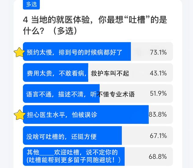 土土曾在留学群里做过一个小调研,400多人的投票结果显示,近8成留学生承认用AI看过病。而大家在国外看病的难题,除了觉得价格贵,还有83.8%的留学生都是担心医生水平,怕被误诊,也有73.1%苦于预约太慢,排到号的时候病都好了。