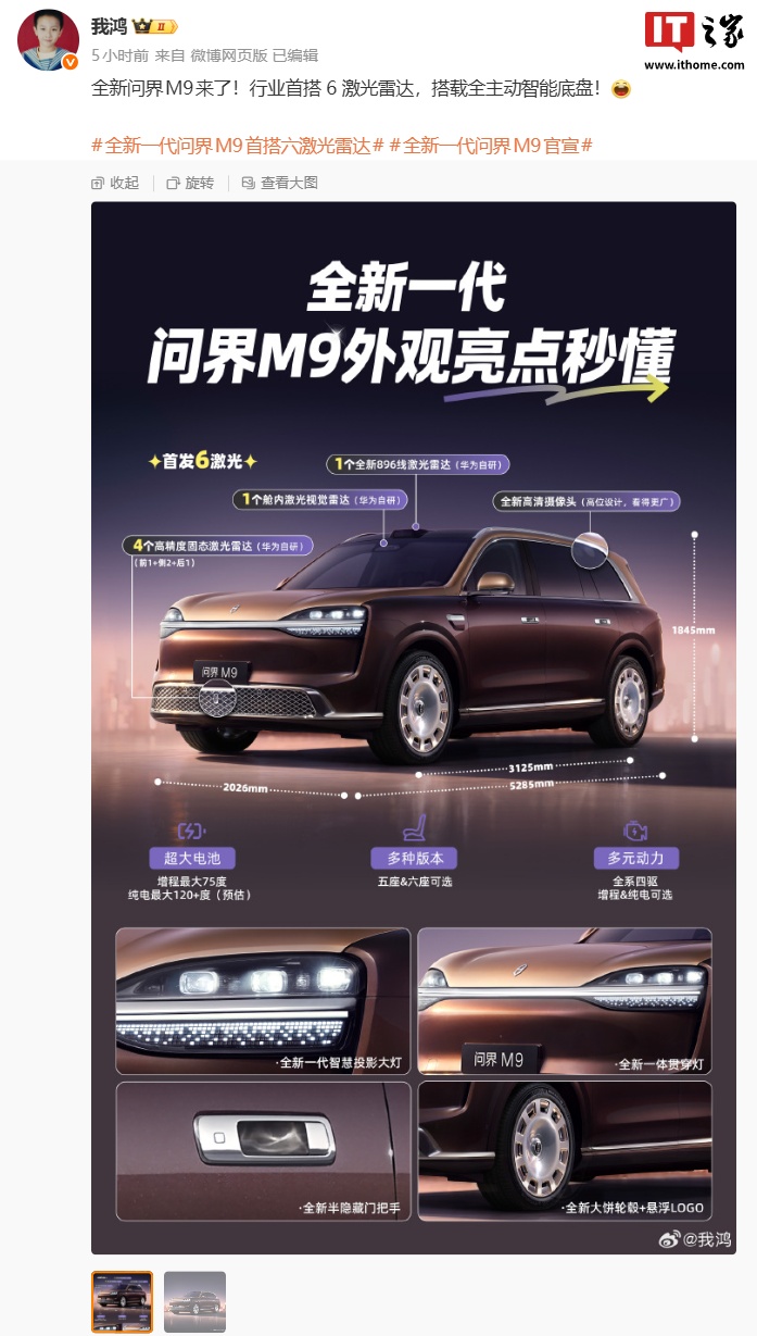 IT之家注意到,博主 @我鸿 今日分享了全新一代问界 M9 的外观亮点。据介绍,新车将首搭 6 激光雷达(包含 1 个华为自研全新 896 线激光雷达、1 个舱内激光视觉雷达、4 个高精度固态激光雷达),并搭载全主动智能底盘。