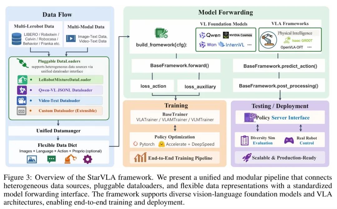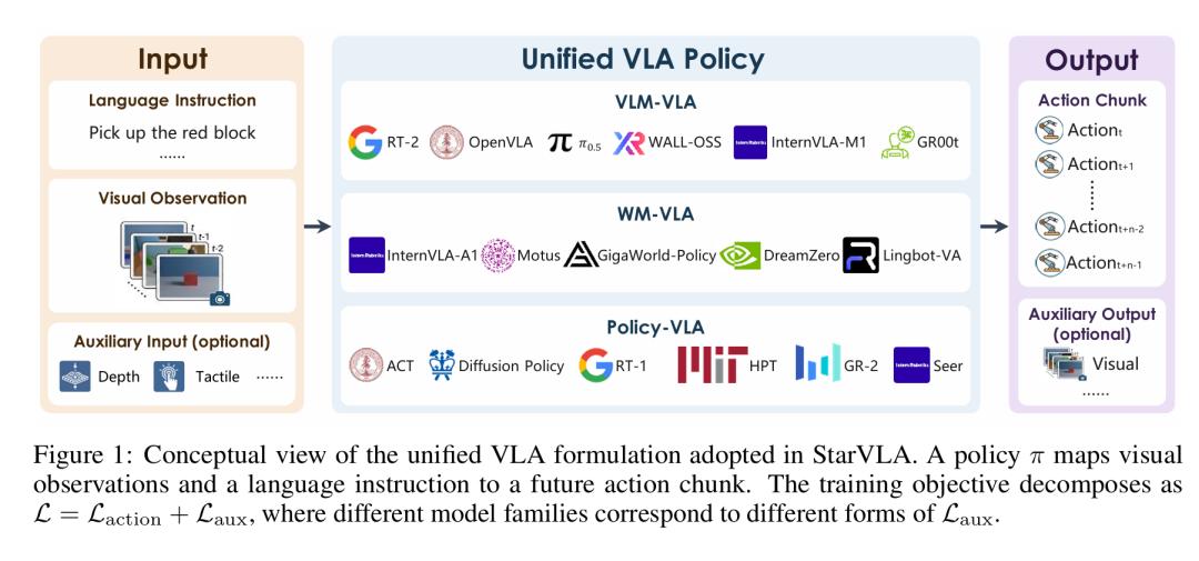 StarVLA 在系统层引入了统一的策略中心公式,将多模态观测、语言指令与未来动作块映射到同一计算图中: