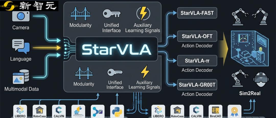 【导读】当前具身智能的VLA(Vision-Language-Action)赛道正陷入典型的「碎片化」泥潭:不同团队采用异构的动作解码范式、强耦合的数据管线、互不兼容的评测协议,导致方法难以横向对比,复现成本极高。开源项目 StarVLA 没有选择堆砌算力或盲目刷榜,而是从系统抽象层面直击痛点,提出了一套Backbone-Action Head的「乐高式」统一架构。
