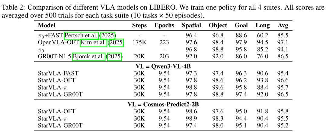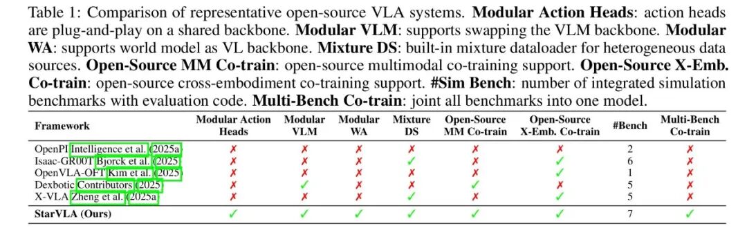 所有变体共享同一数据接口、训练循环与评测管线,仅需替换Backbone或Action Head即可完成范式切换。 这彻底消除了跨方法对比时的「隐性变量干扰」。