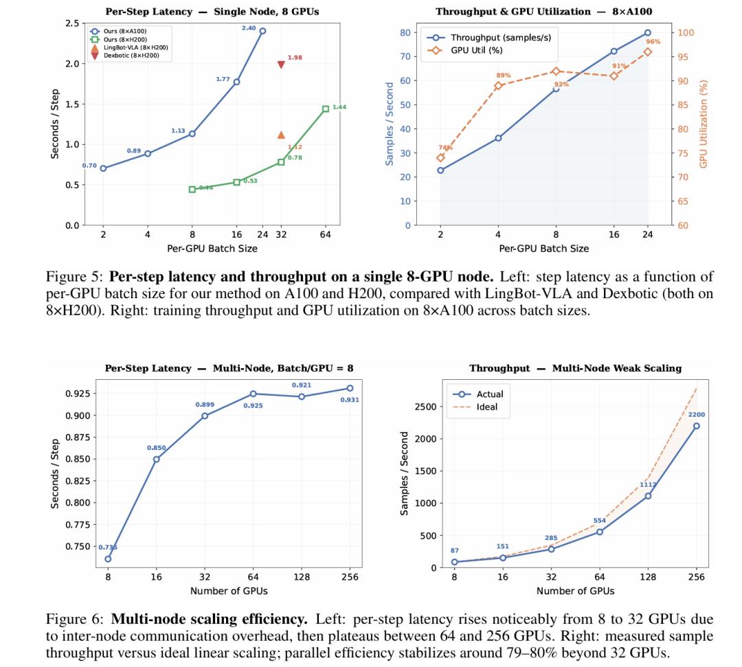 计算效率方面:8×A100单节点测试显示,Per-GPU Batch Size=8时GPU利用率达92%,样本吞吐量56.6 samples/s;扩展至256 GPU多节点时,通信开销仅在8→32 GPU阶段产生一次跃升(0.735s→0.899s/step),随后稳定在~0.93s,并行效率维持在79%~80%,为大规模分布式训练提供明确的Scaling Guide。