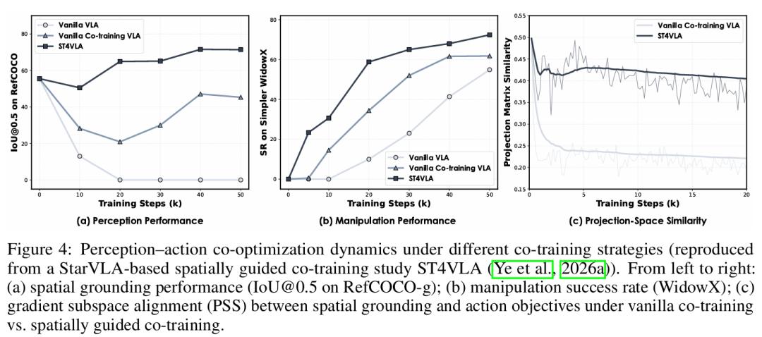 StarVLA 内置双数据流协同机制:交替执行 VLA 动作前向与 VLM 语言建模前向,通过trainer.loss_scale.vlm动态平衡动作学习与多模态表征保留。实验表明,协同训练可显著提升空间grounding能力,并在WidowX与Google Robot 上带来4%~10%的成功率增益。