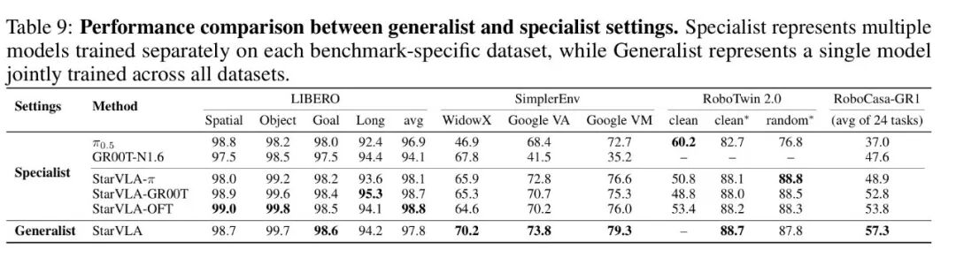 在跨基准Generalist设置中,单模型联合训练LIBERO + SimplerEnv + RoboTwin 2.0 + RoboCasa-GR1,RoboCasa平均成功率从Specialist最优的48.8%提升至57.3%,证明了统一管线下All-in-One训练的可行性。