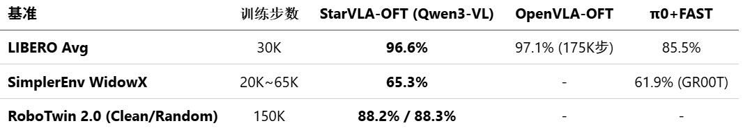 StarVLA 刻意避免复杂的数据工程与在线优化(如 DAgger),仅用公开 VL 预训练权重在基准官方演示集上微调,即可达到极具竞争力的性能: