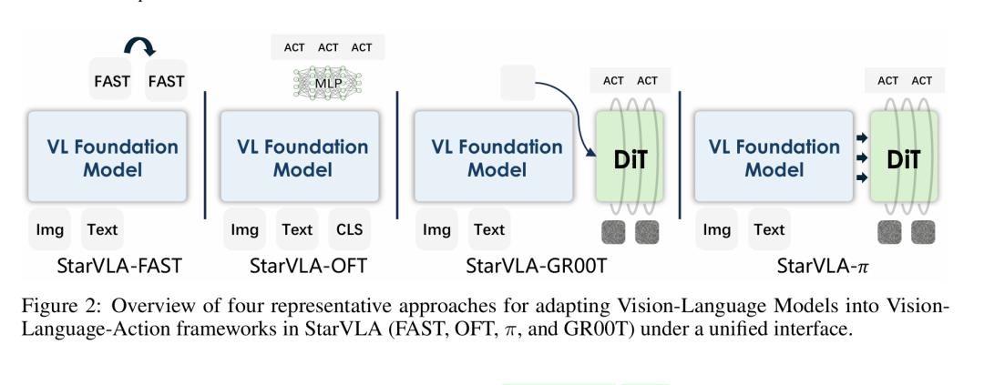 - 架构割裂:自回归离散Token化、并行连续回归、流匹配去噪、双系统推理……不同动作解码范式采用完全不同的代码实现与接口假设。