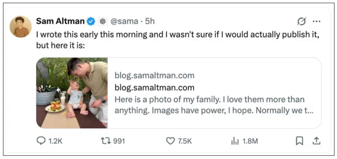 事后,奥特曼在其个人博客上发布了一张家人照片,写道,“我希望图片是有力量的……希望能打消下一个向我家扔燃烧瓶的念头,不管他们对我有什么看法。”