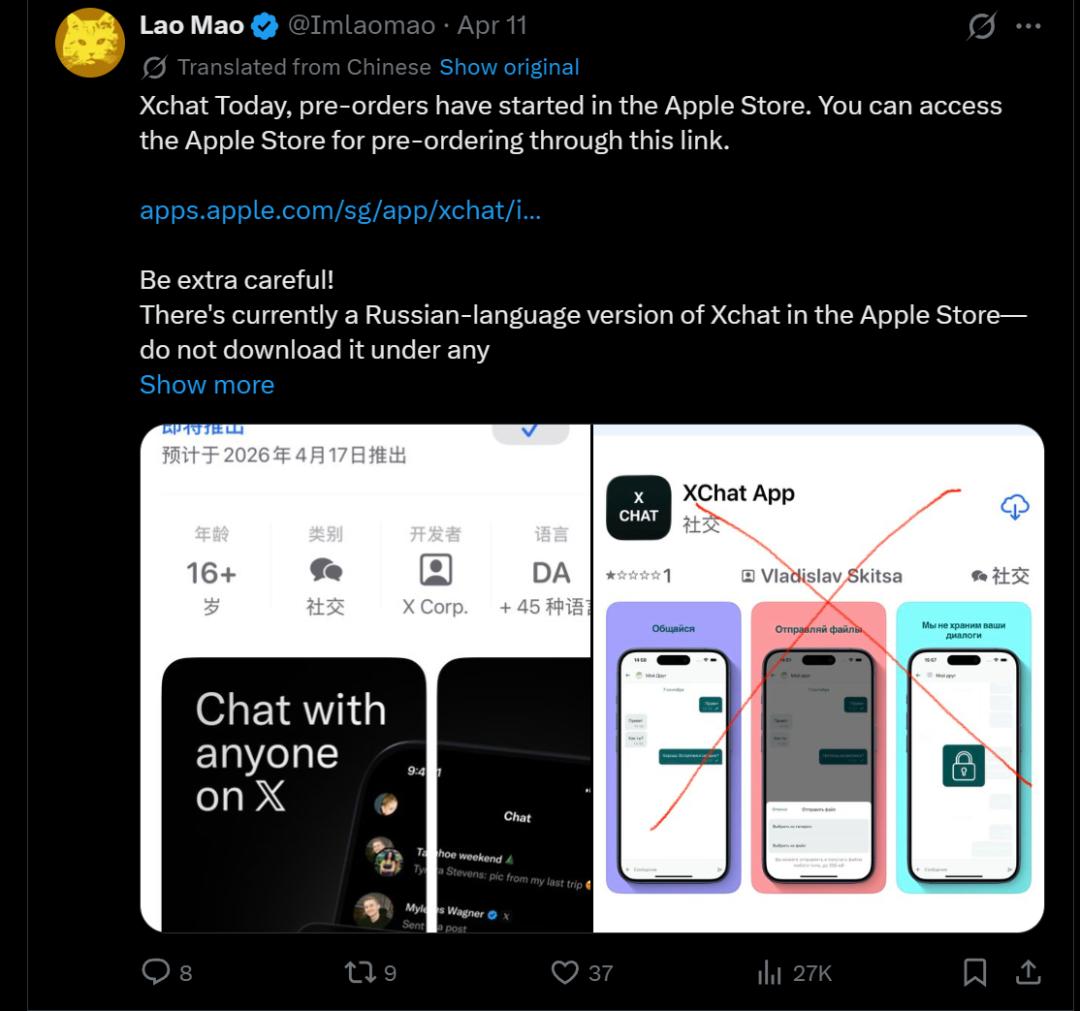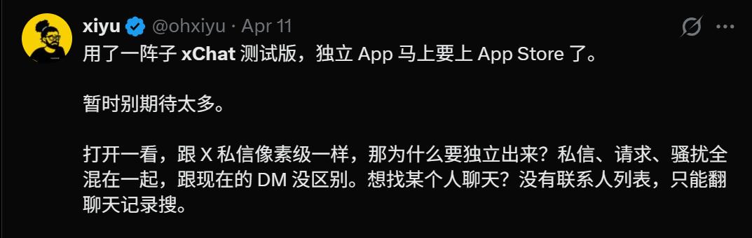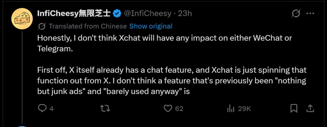而且网友顺带叠甲保命,真要寄希望于Xchat,那就再等两三年吧,估计等完善了才行。