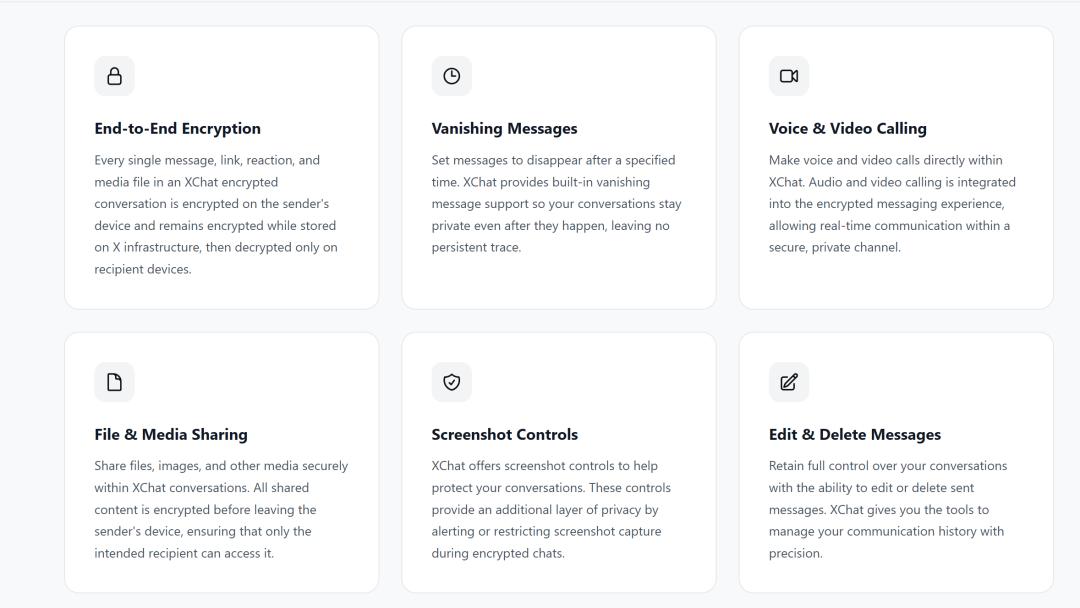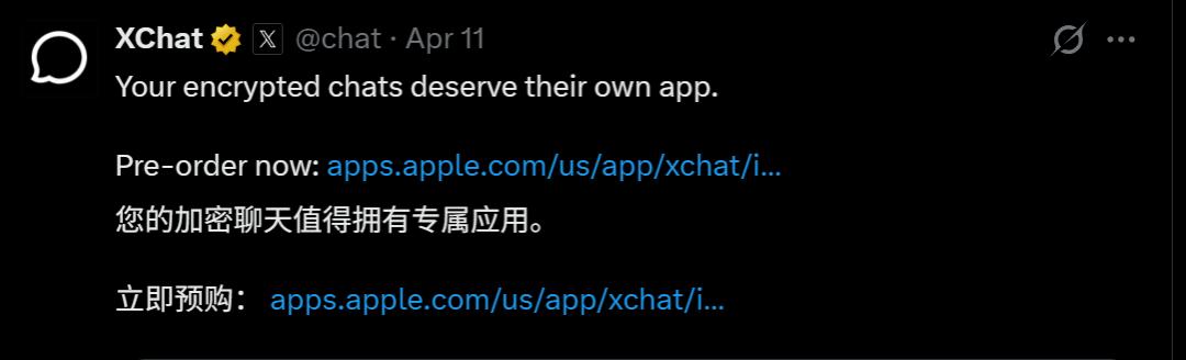 从官方释出的应用消息来看,XChat核心主打加密聊天,其官宣推文可谓相当言简意赅: