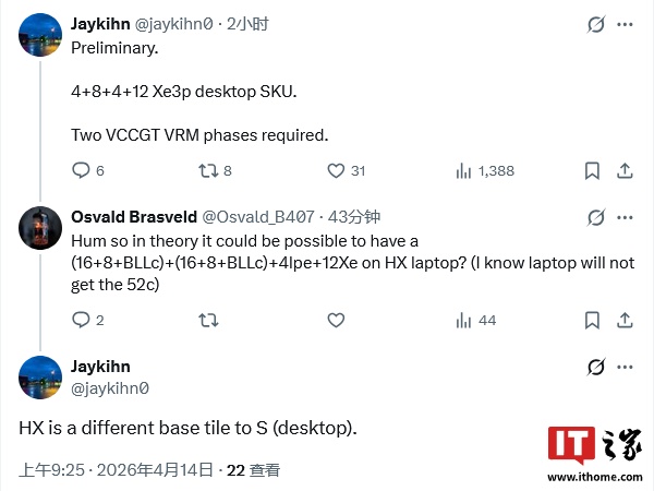 IT之家 4 月 14 日消息,消息人士 @jakihn0 今日早些时候爆料称,英特尔初步规划了一款 4+8+4+12 Xe3p 规格的桌面处理器,该 SKU 需要两相的 VccGT 核显供电。