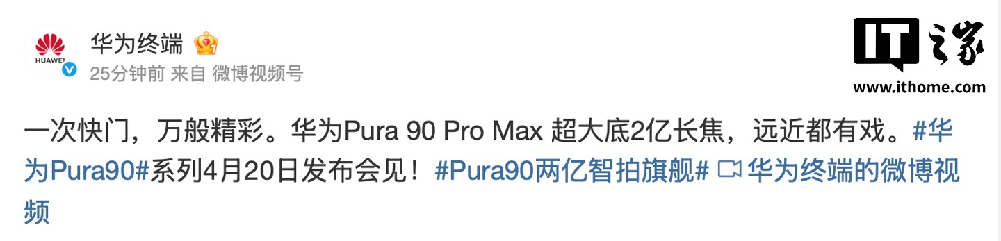 IT之家 4 月 14 日消息,华为 Pura 90 系列及全场景新品发布会官宣定档 4 月 20 日,华为终端今日预热,华为 Pura 90 Pro Max 搭载超大底 2 亿长焦,远近都有戏。