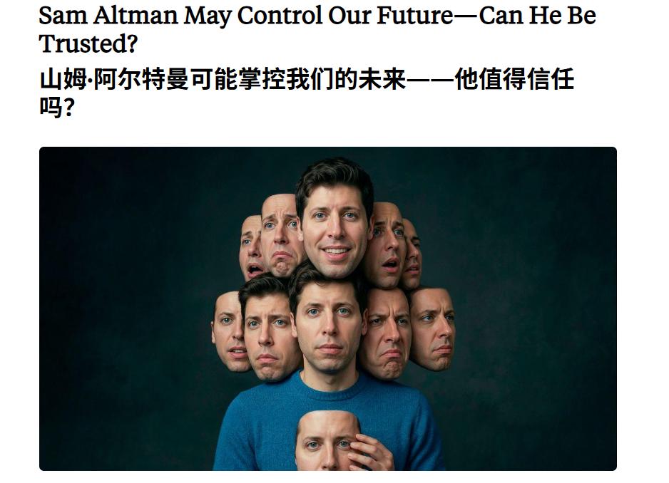 很多人认为,他提到的这篇报道是《纽约客》的深度调查,报道的标题非常直接——山姆·阿尔特曼可能掌控我们的未来——他值得信任吗?(Sam Altman May Control Our Future—Can He BeTrusted?)