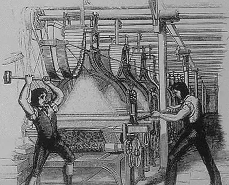 18世纪晚期,莱斯特郡的纺织工人卢德,因抗议工厂主的压迫捣毁了织袜机。此后,无数熟练工匠追随其后,砸毁纺织机、剪毛机,用最原始的暴力,对抗着夺走他们生计的新机器。那时的他们,是被时代抛弃的边缘人,是技术变革的牺牲品,他们的愤怒,源于“手停口停”的生存焦虑,源于传统技艺被机器碾压的绝望。