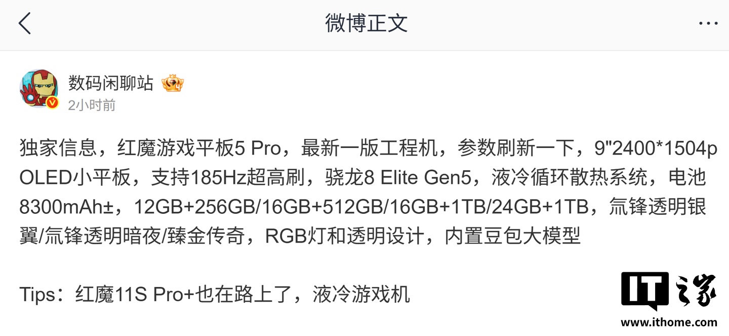 IT之家 4 月 14 日消息,博主 @数码闲聊站 今天在微博爆料,红魔游戏平板 5 Pro 最新一版工程机搭载 9 英寸 2400*1504p OLED 屏幕。
